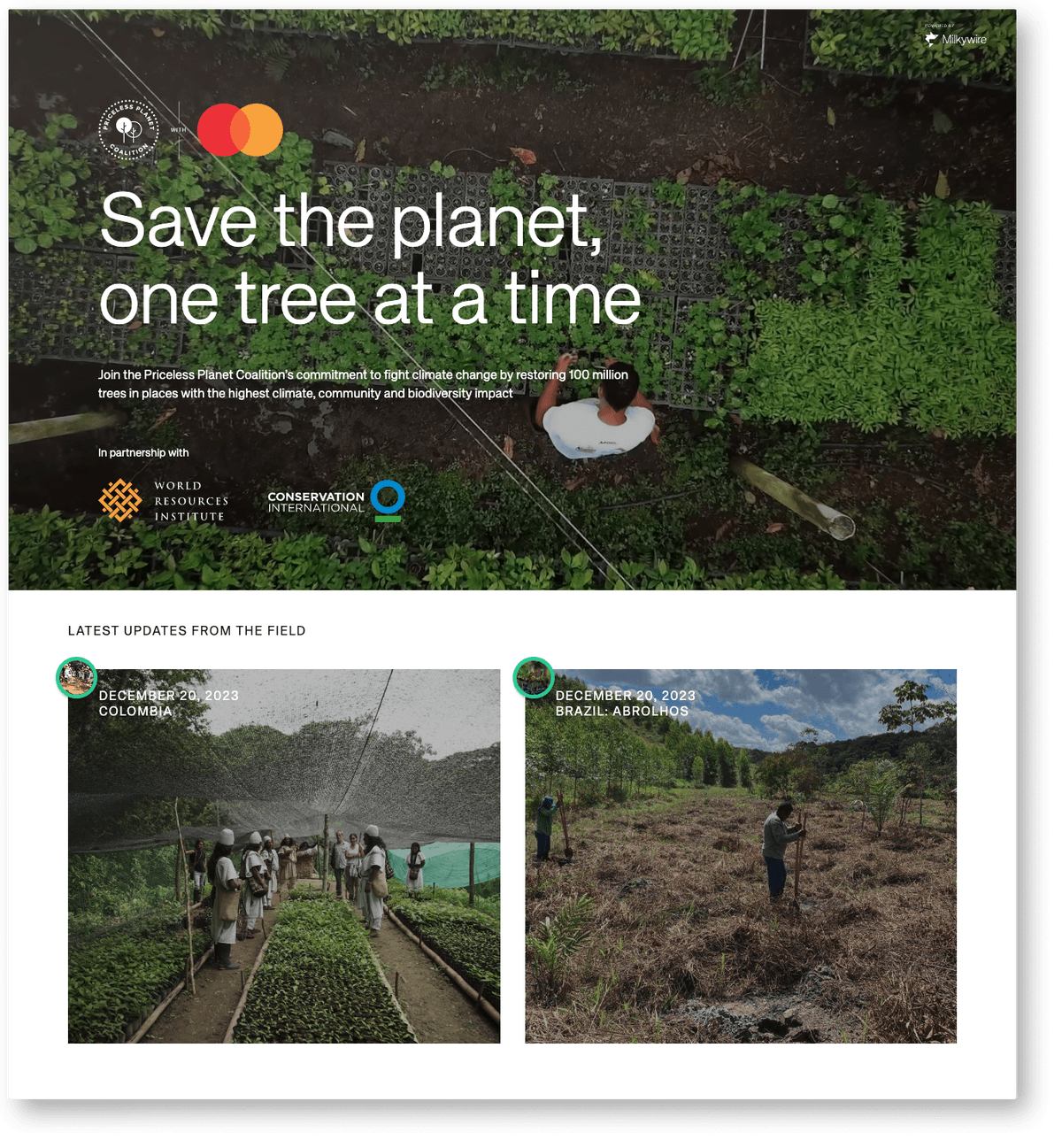 The Priceless Planet Coalition unites the efforts of individuals, businesses, and corporate partners to fight climate change by funding the restoration of 100 million trees. This is done in collaboration with Mastercard and climate science and forest restoration experts, Conservation International and the World Resources Institute. In an effort to further engage their coalition partners and consumers, Mastercard uses Milkywire’s tech integration and Impact Portal to provide plug-and-play landing pages that offer consumer donation solutions.