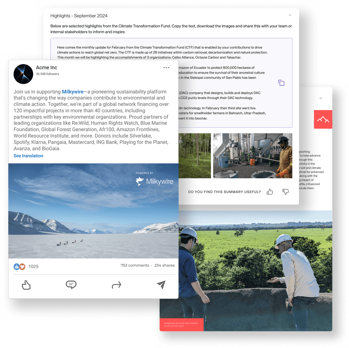 Access a complete set of resources to enhance your sustainability communication. Download photos, videos, and authentic stories to share with your audience. Utilize pre-written posts for Slack, Teams, and other channels, along with communication guidelines and toolkits to keep your stakeholders informed. From ESG reporting guidance to educational materials and insights, you’ll have everything you need to effectively demonstrate the impact of your sustainability efforts.